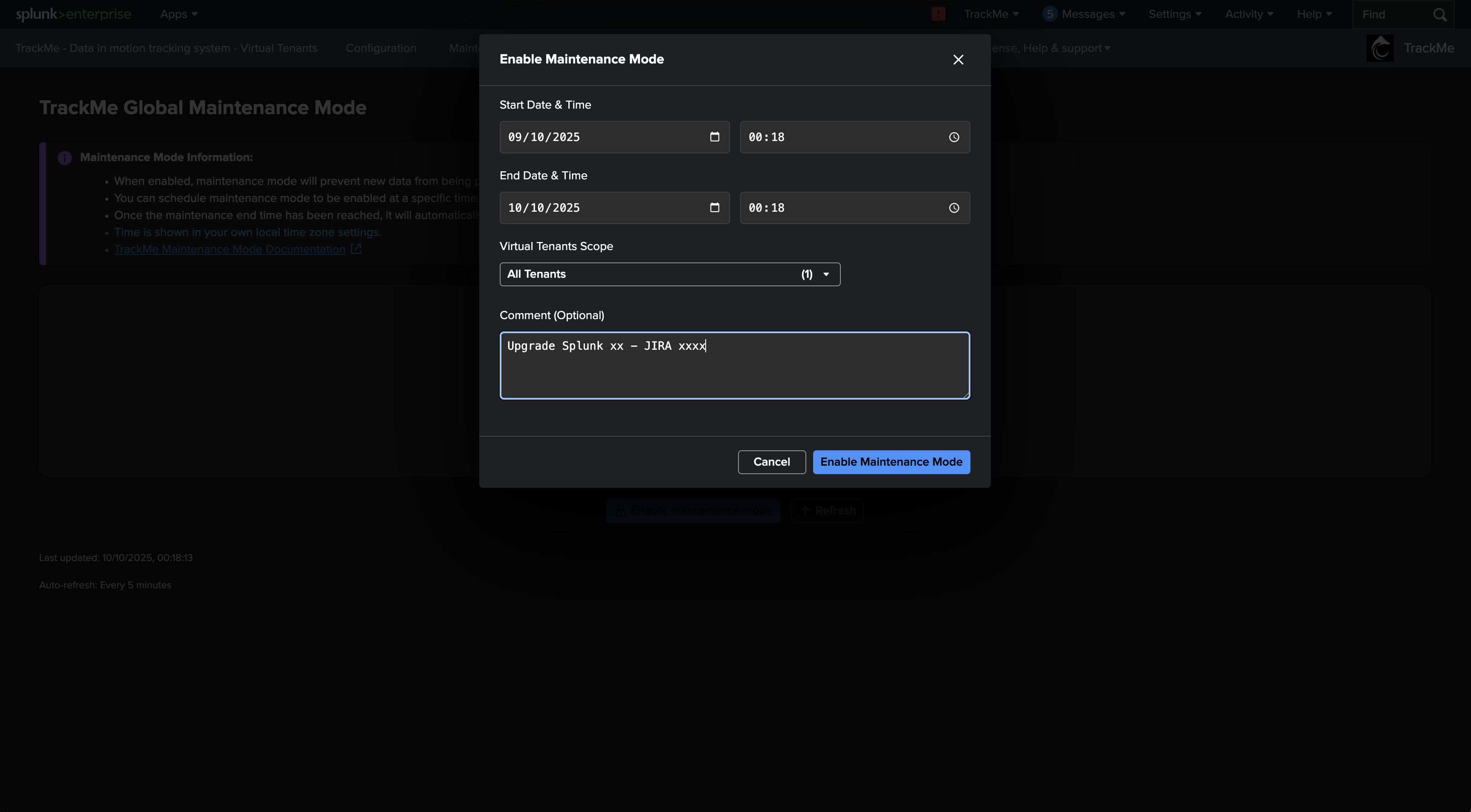 Since TrackMe release 2.0.97, you can define the scope of the Virtual Tenants when enabling the maintenance mode.