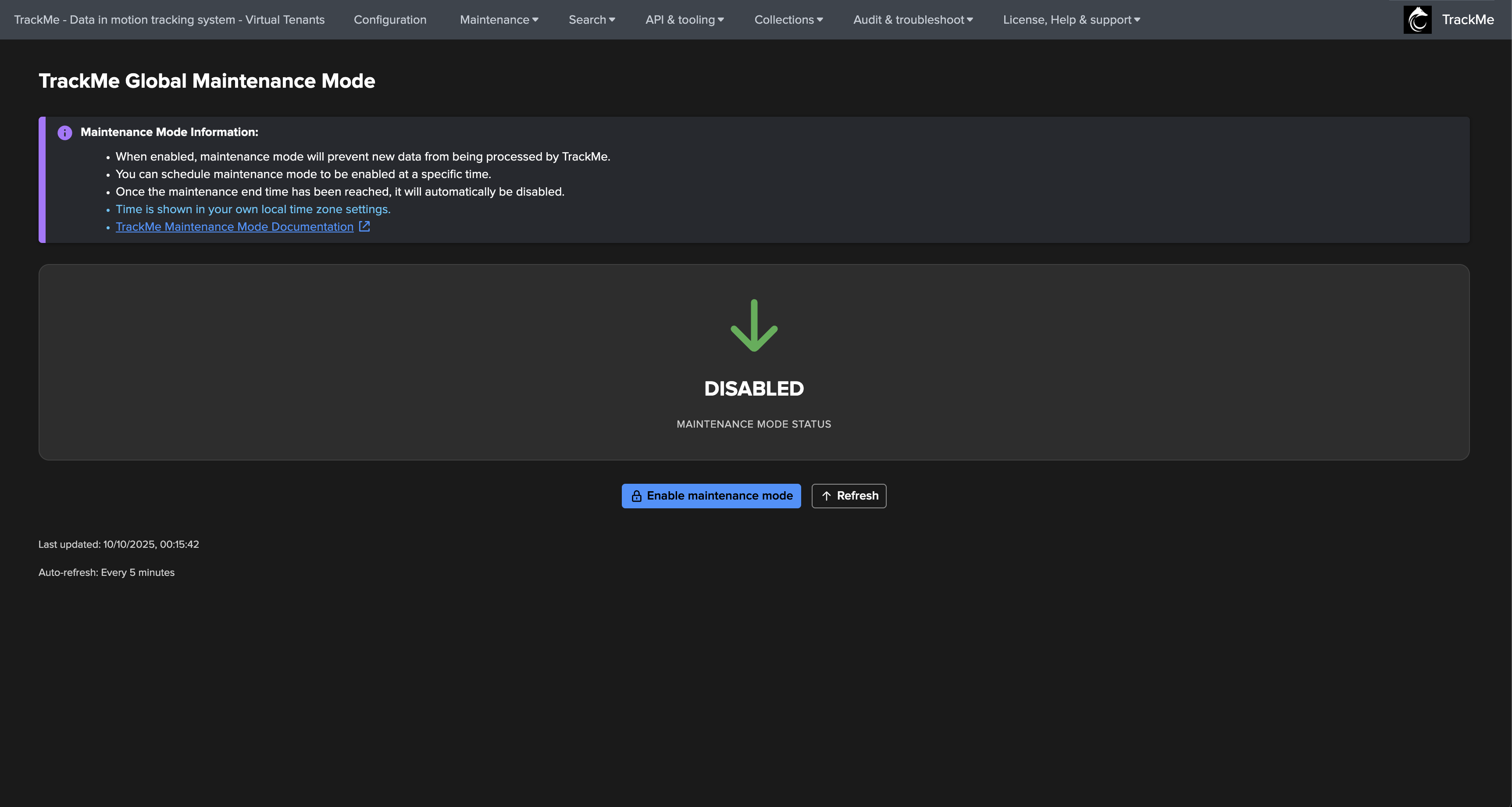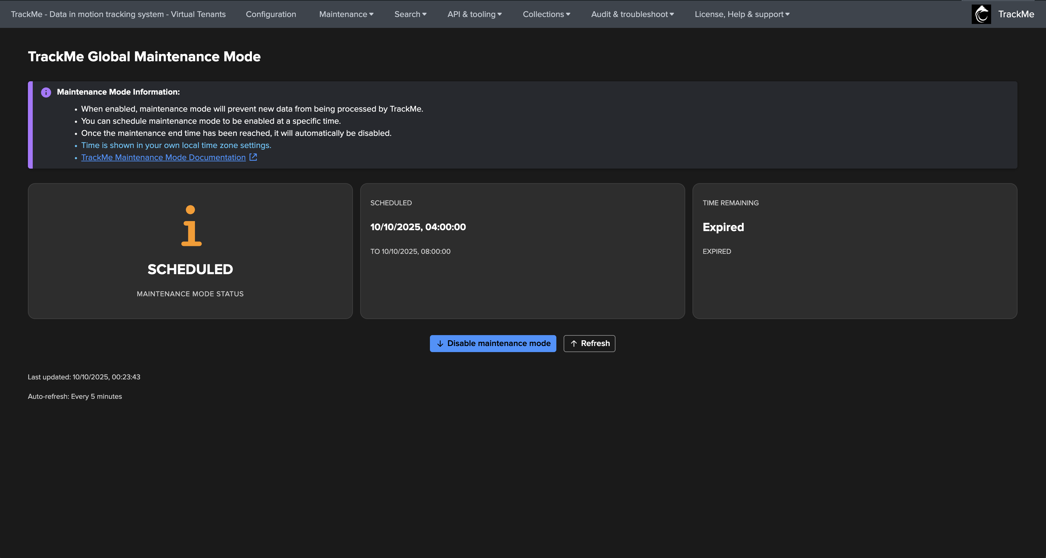 When the maintenance mode is enabled and then disabled, TrackMe automatically creates and maintains a record in the Maintenance Knowledge DataBase as a planned operation.