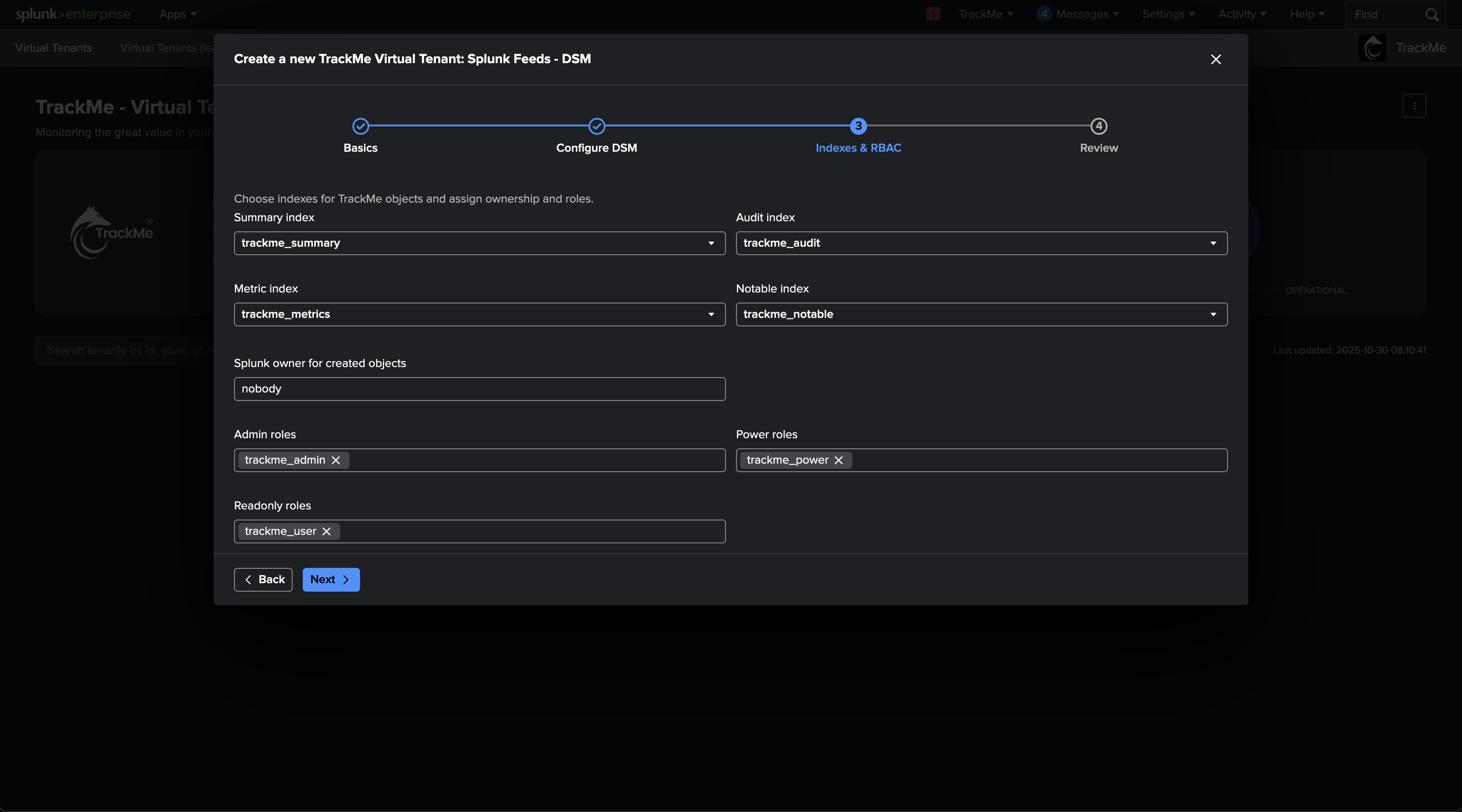 A core concept of TrackMe is called Virtual Tenants, which provides many powerful features. Part of this concept provides the capability to define a per-tenant specific set of indexes.