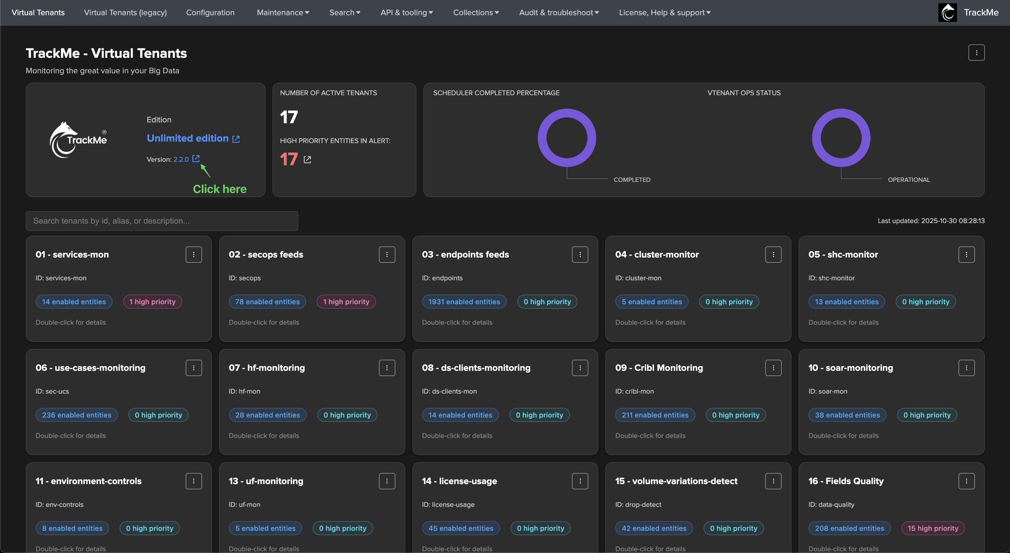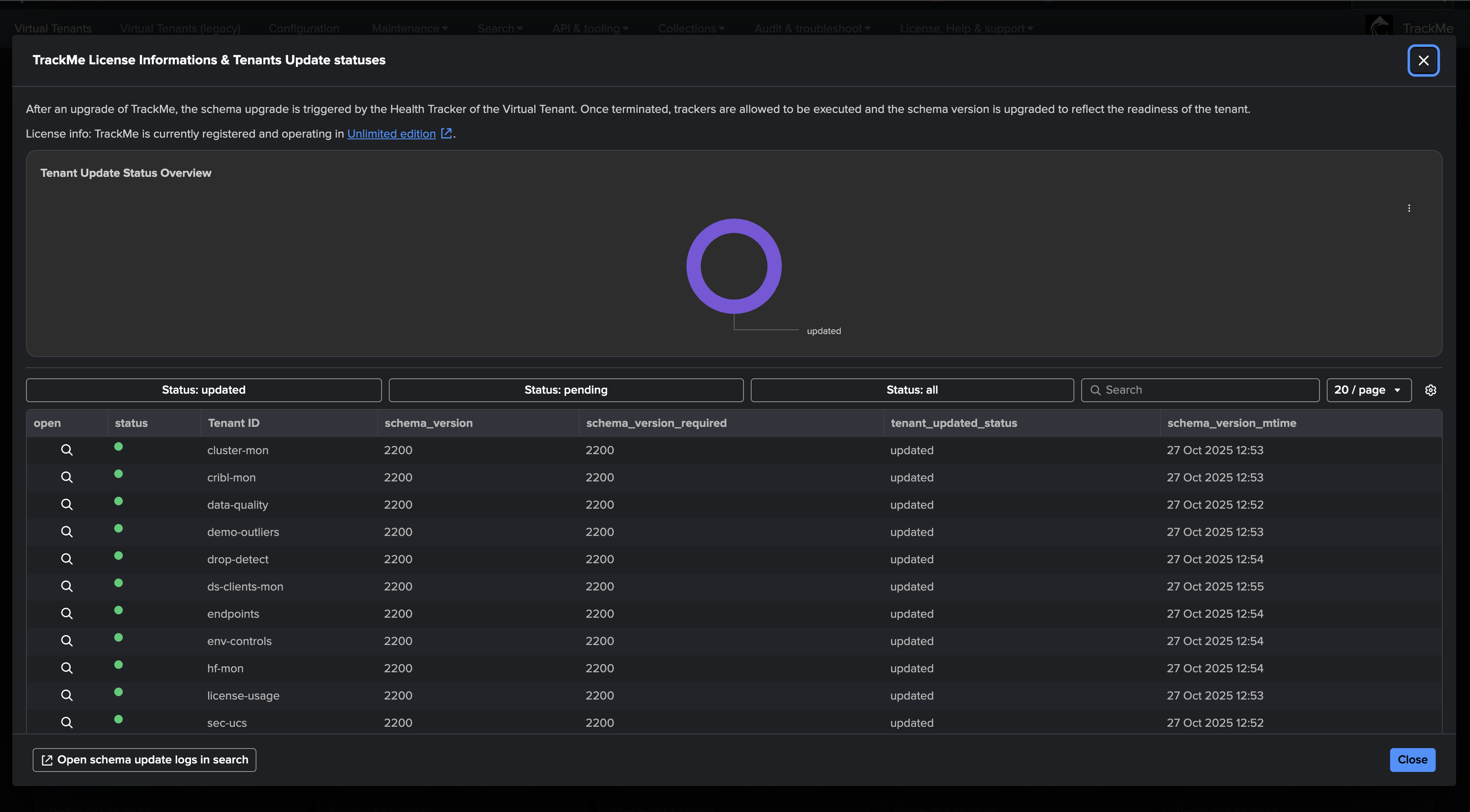 However, TrackMe also implements a sophisticated and automated upgrade process called schema version which is used to dynamically run specific actions depending on the origin version and the state of TrackMe Virtual tenants.