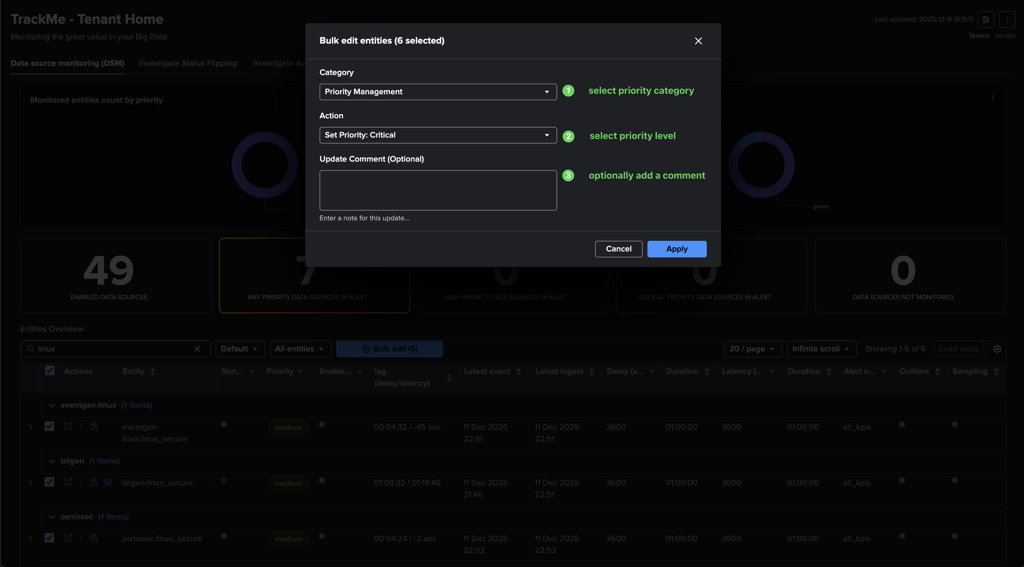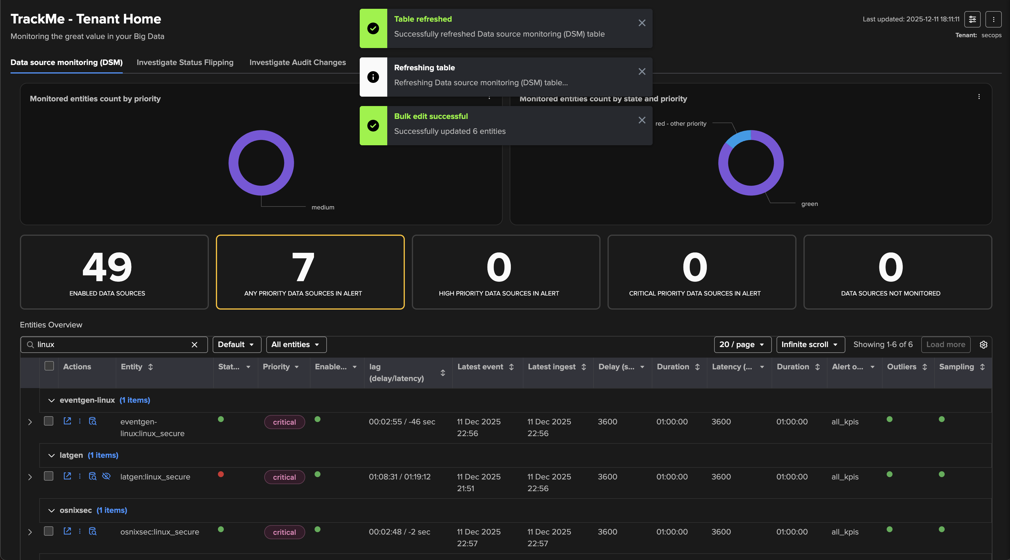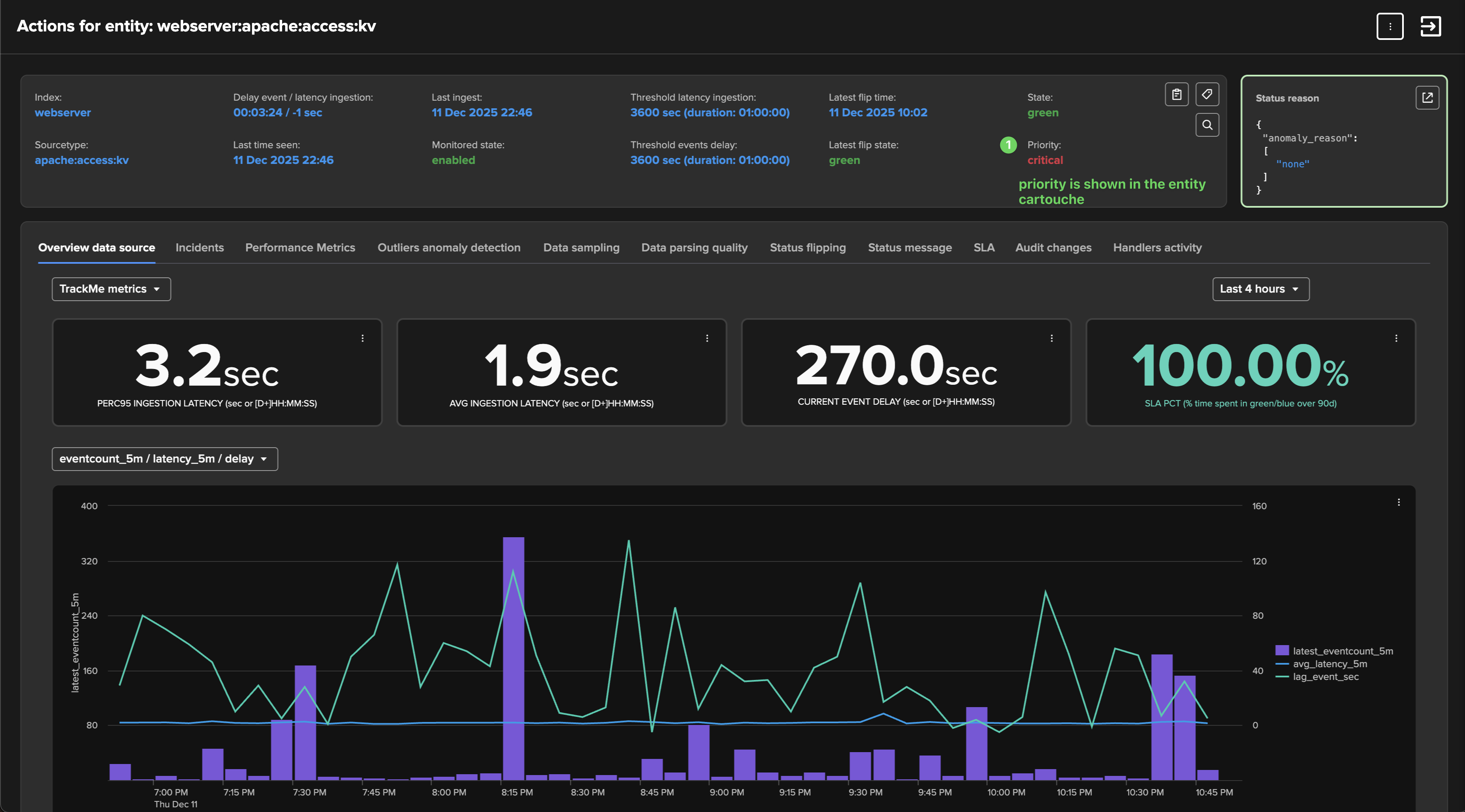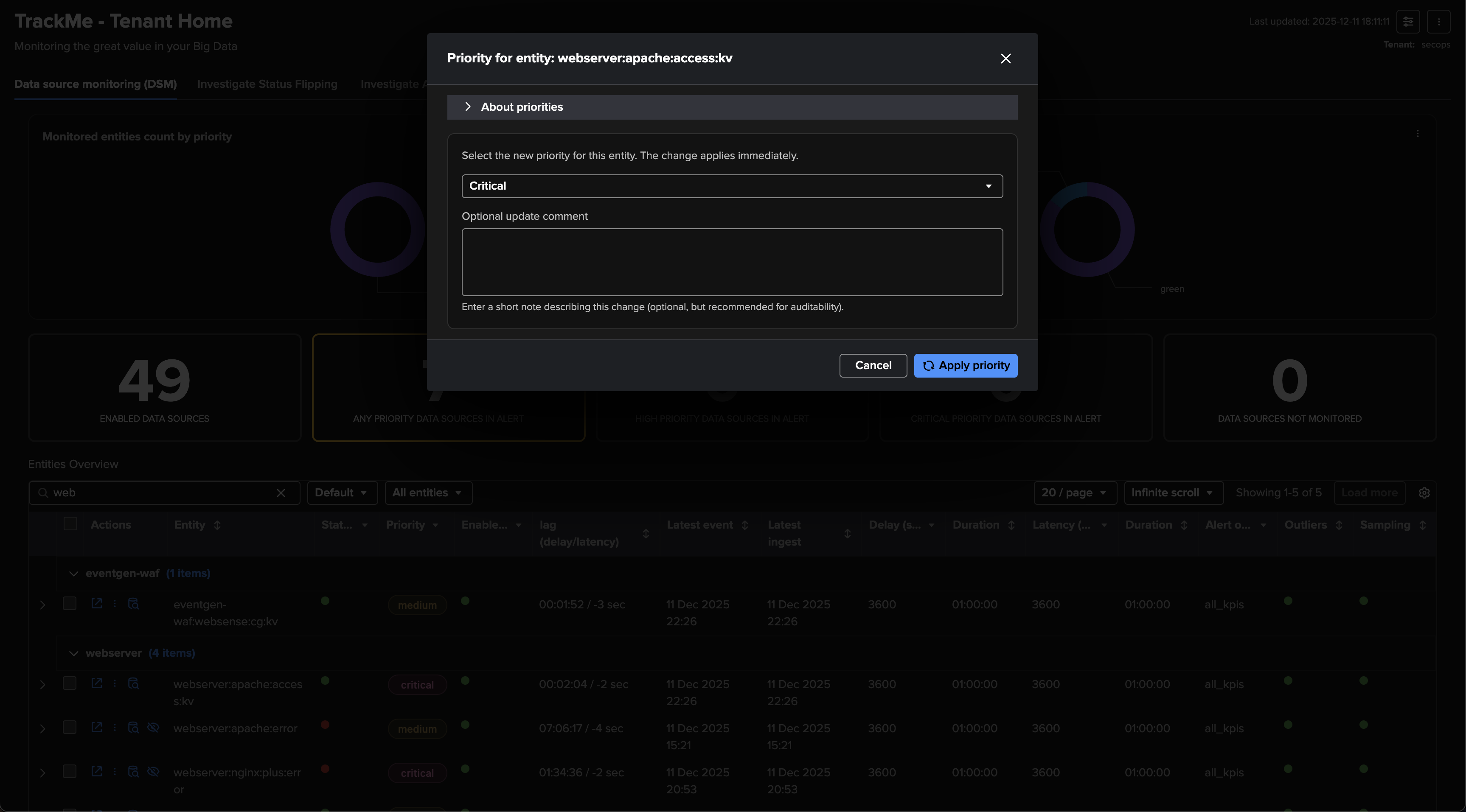 Leverage priority: Use TrackMe’s entities priority feature to distinguish valuable entities from those that are less important. For instance, tagging entities that you have reviewed and qualified as “high” or “critical” can help you focus on the most critical components in your environment.