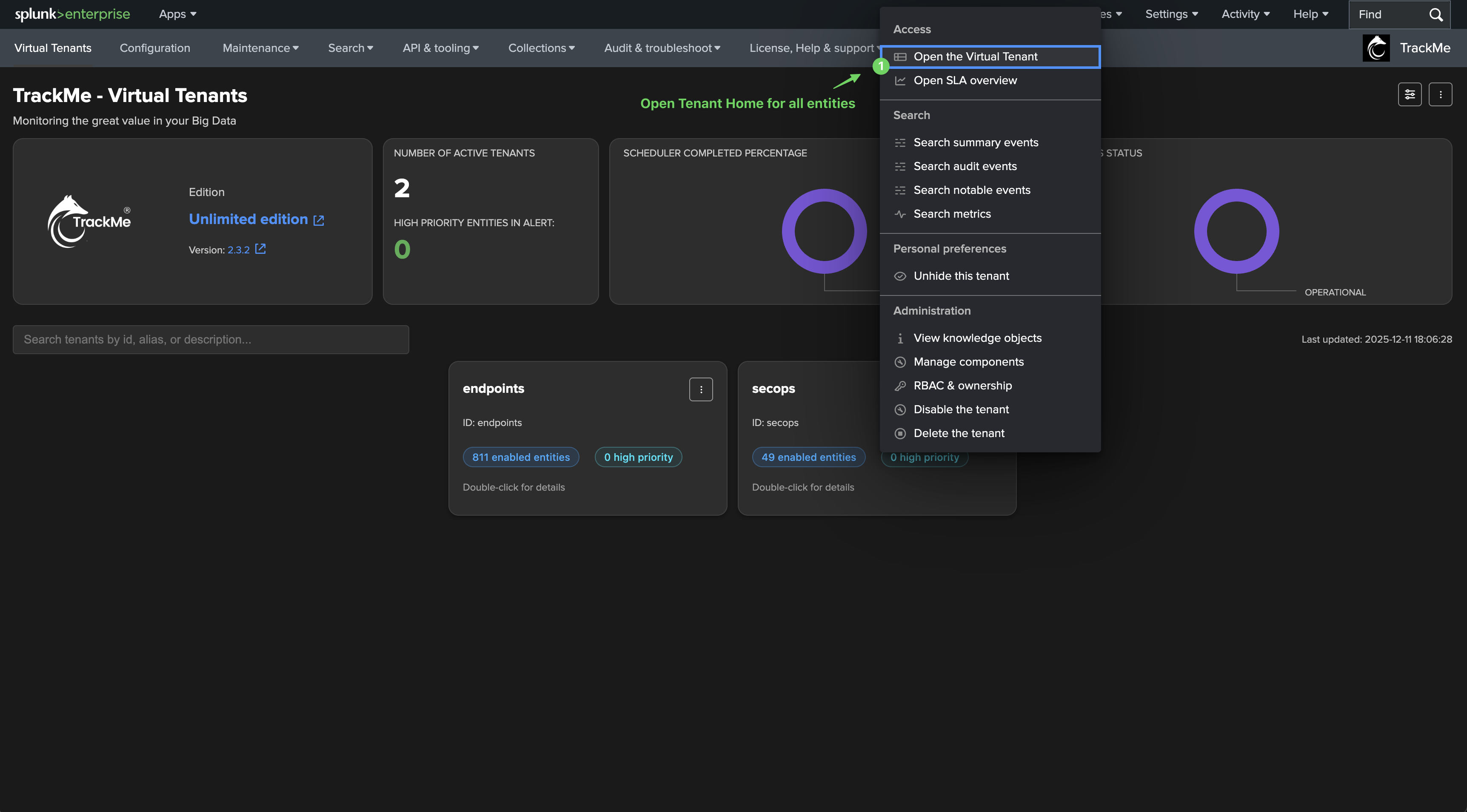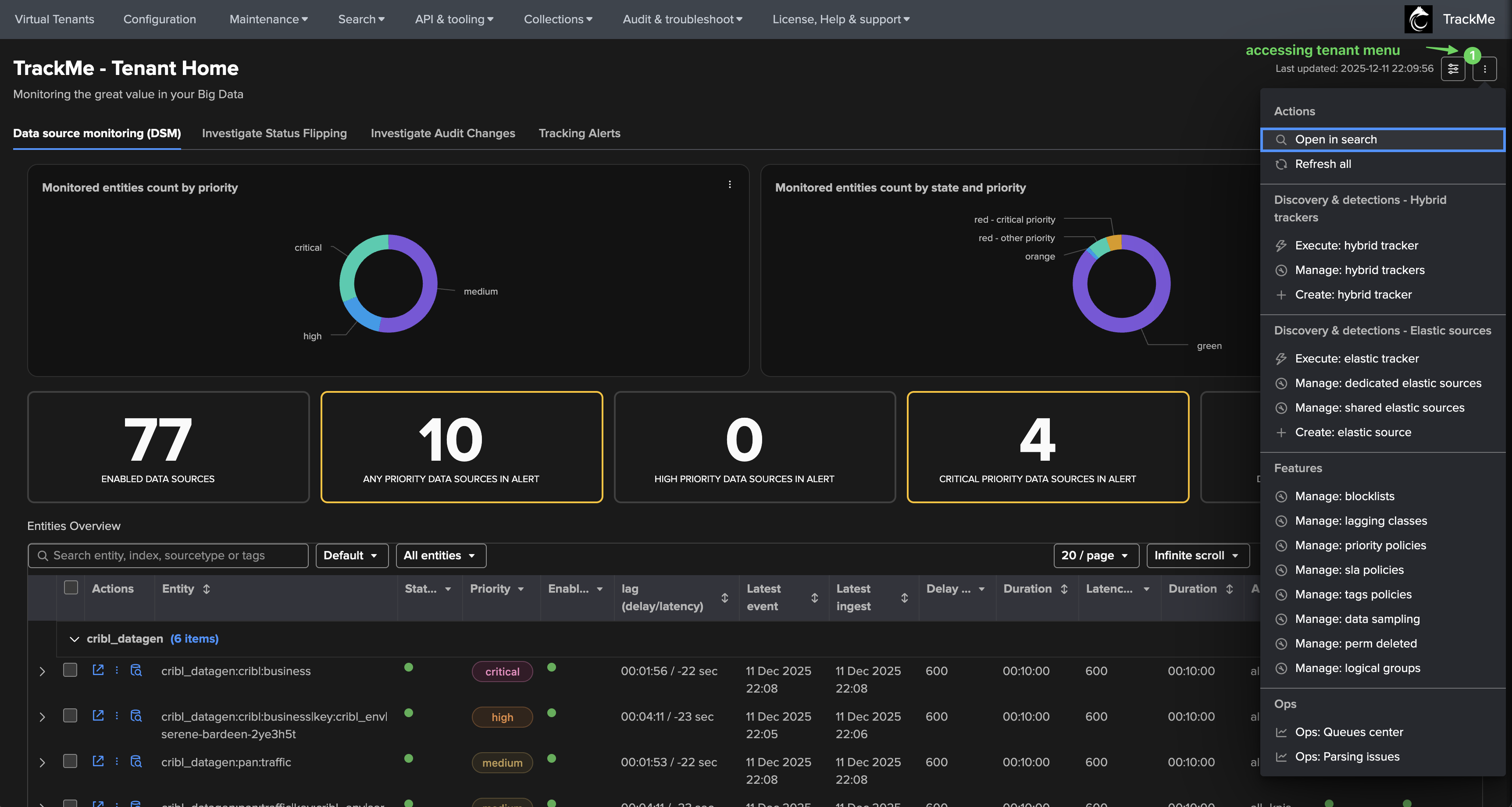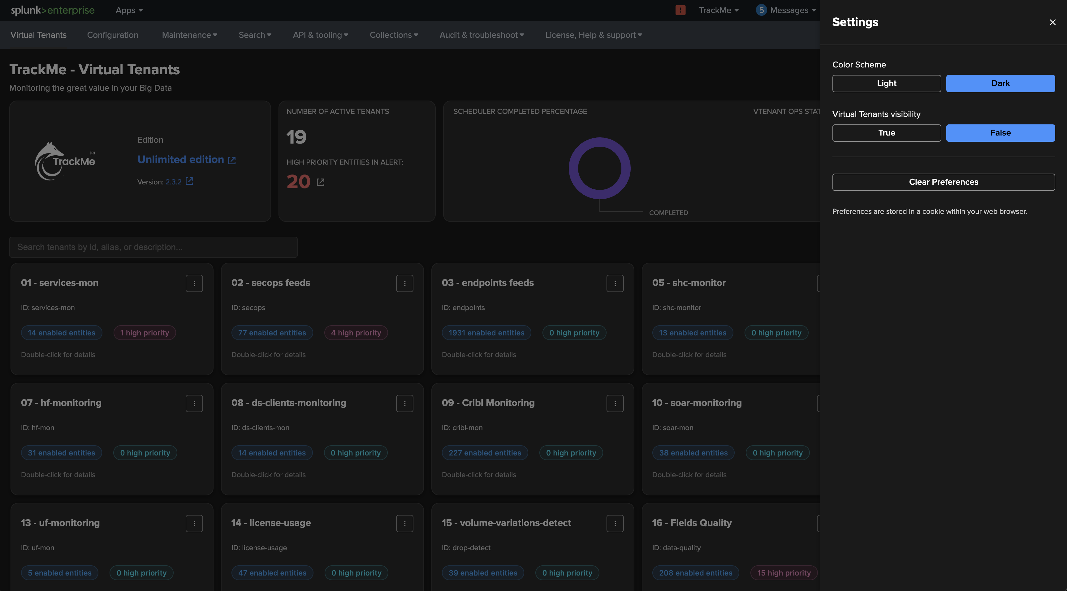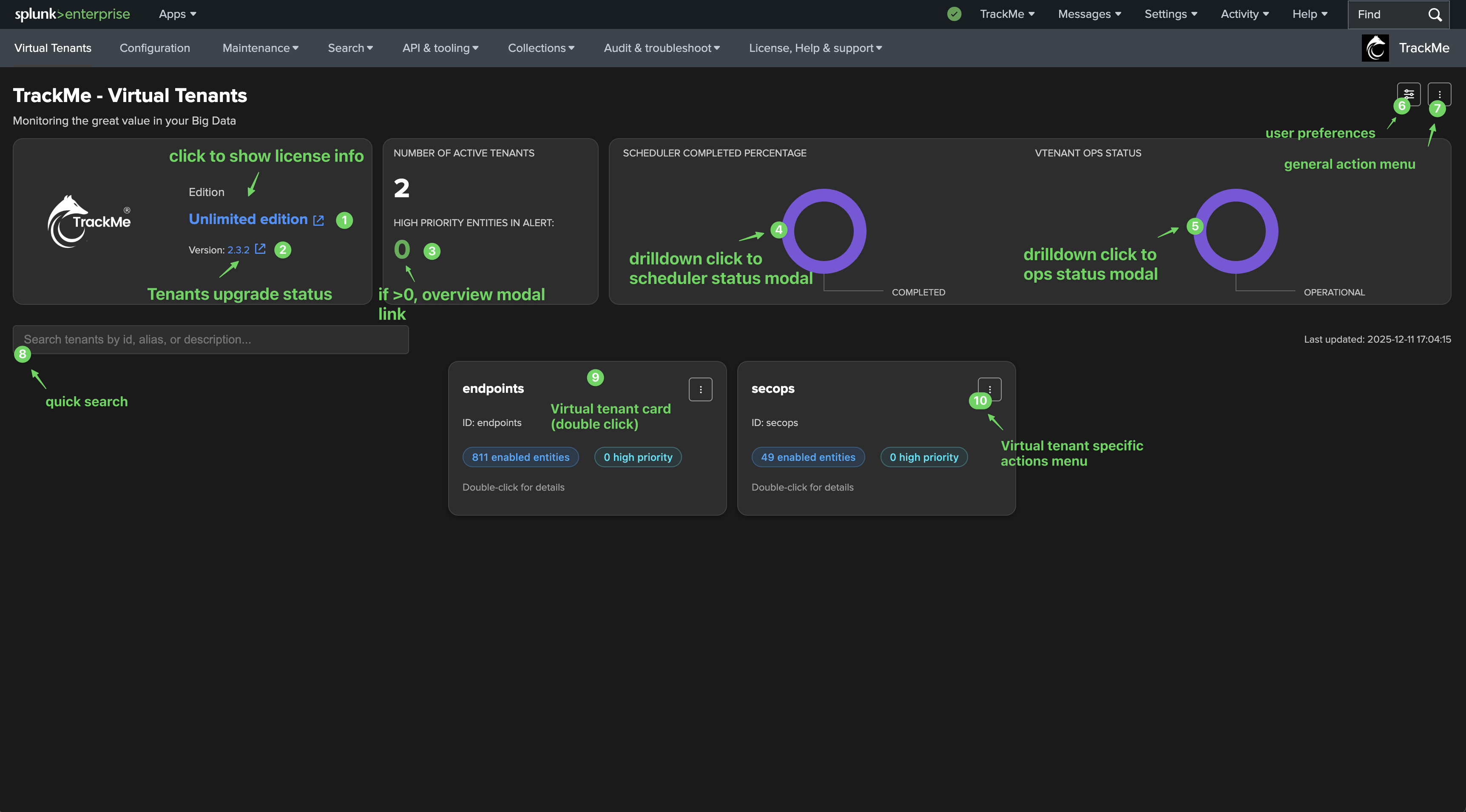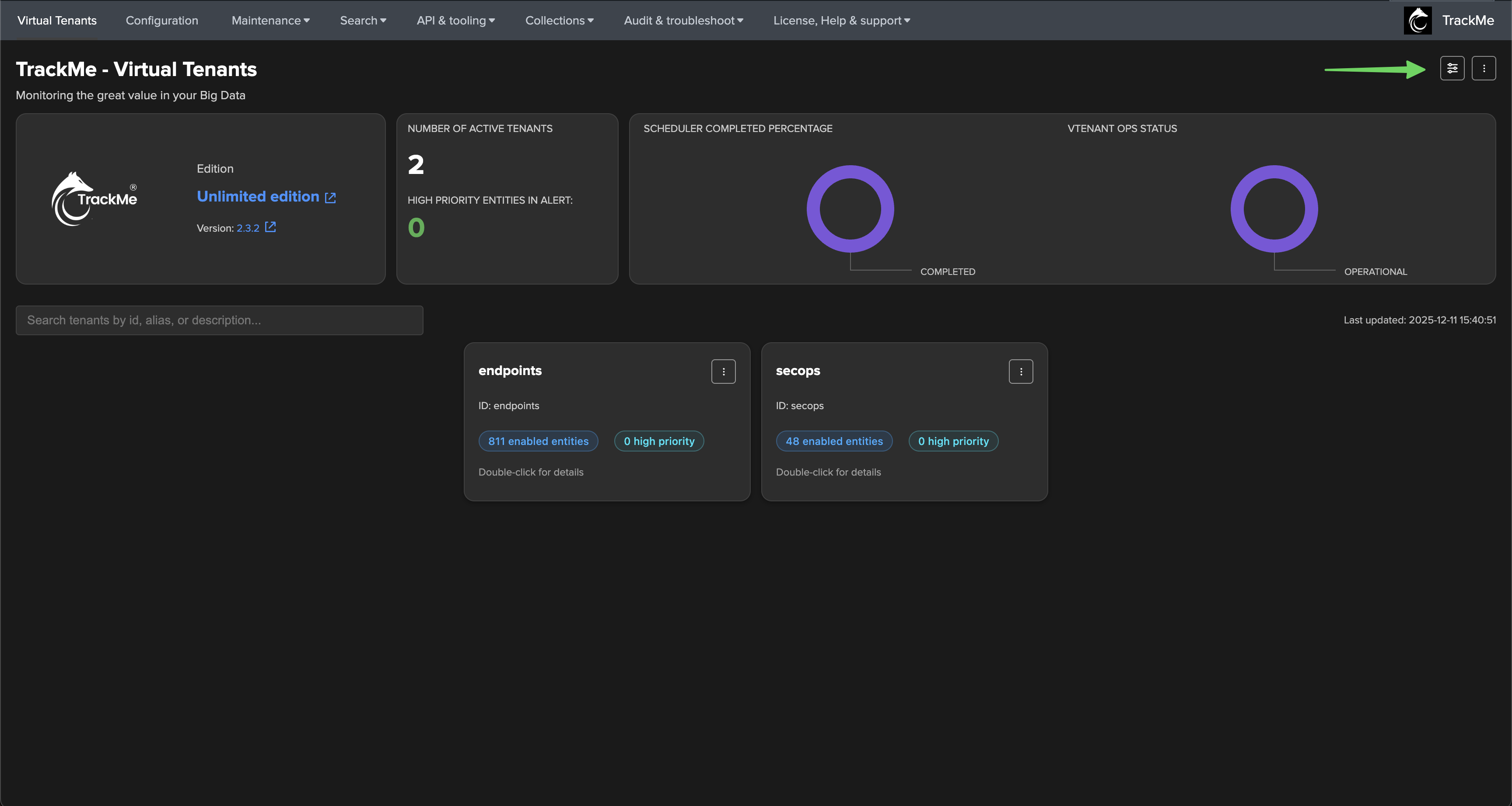 When you open TrackMe, the default page is called the “Virtual Tenant” interface.