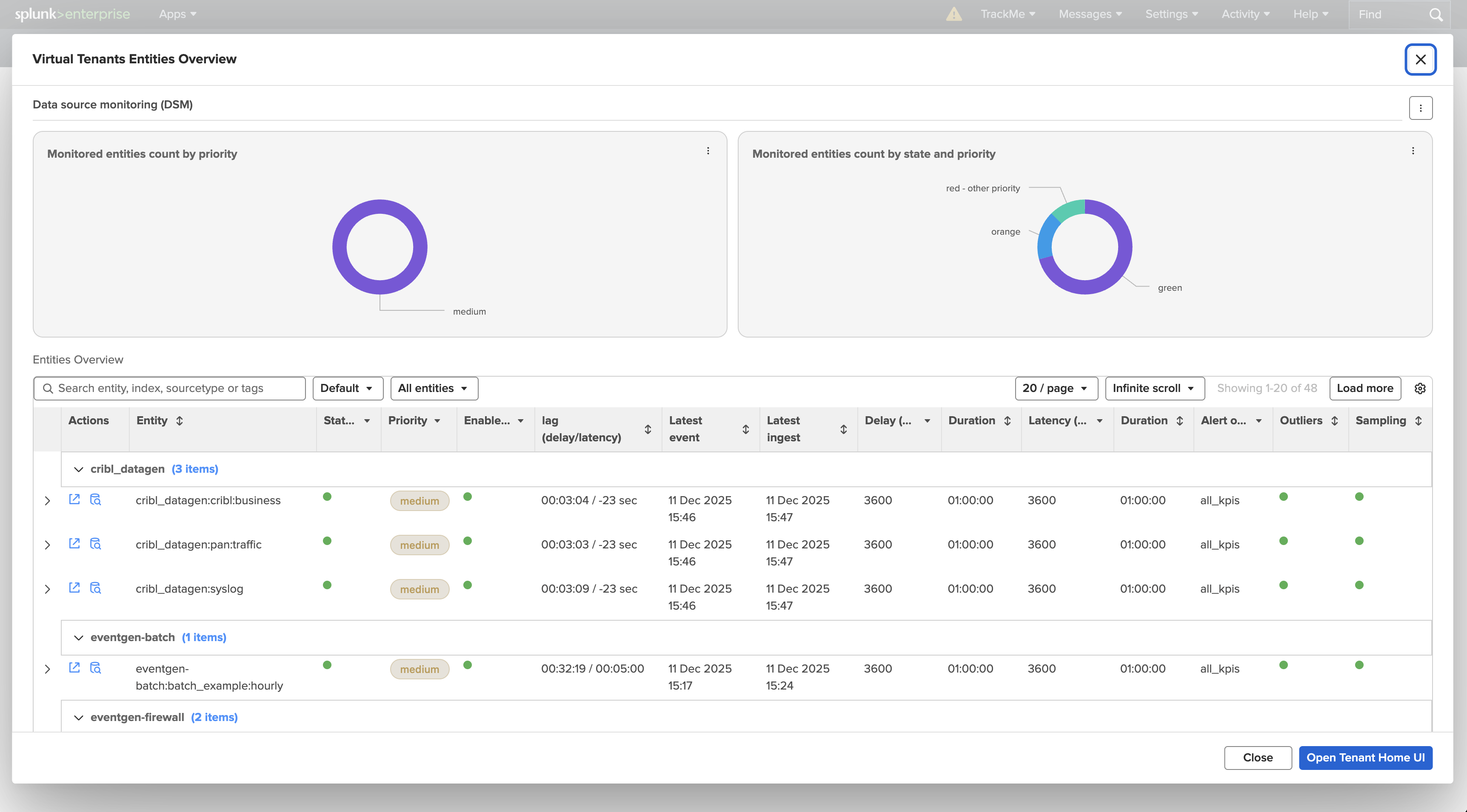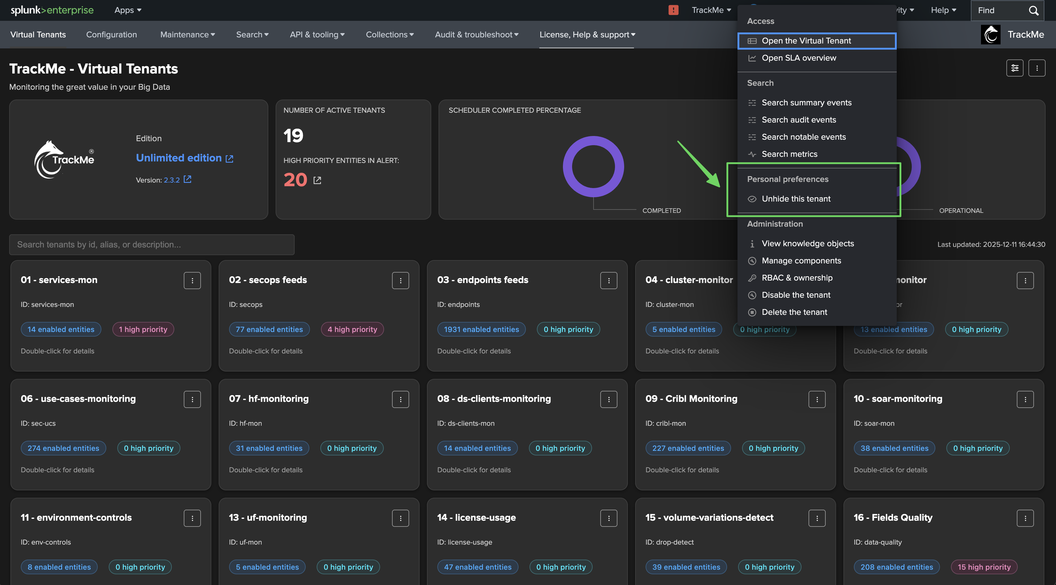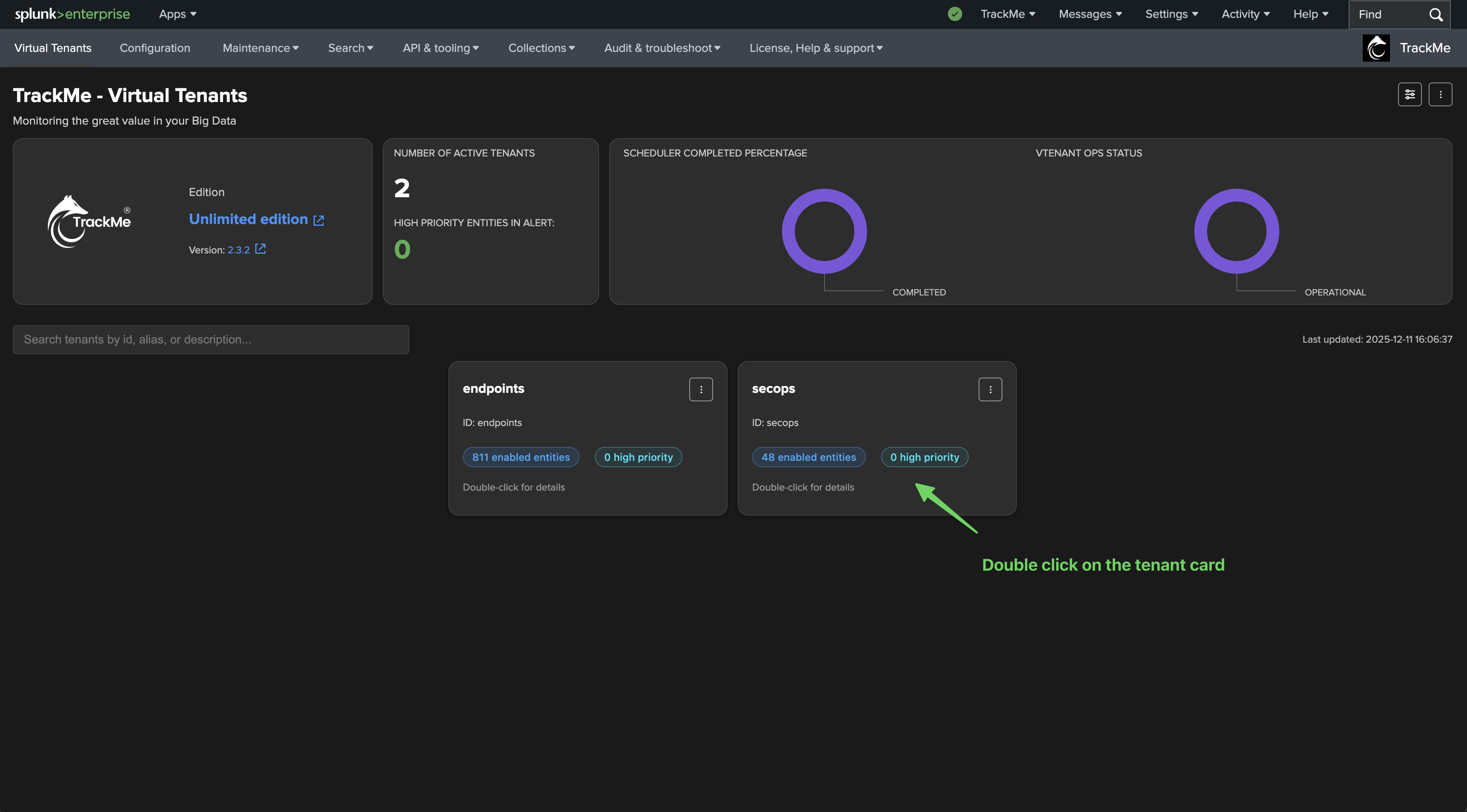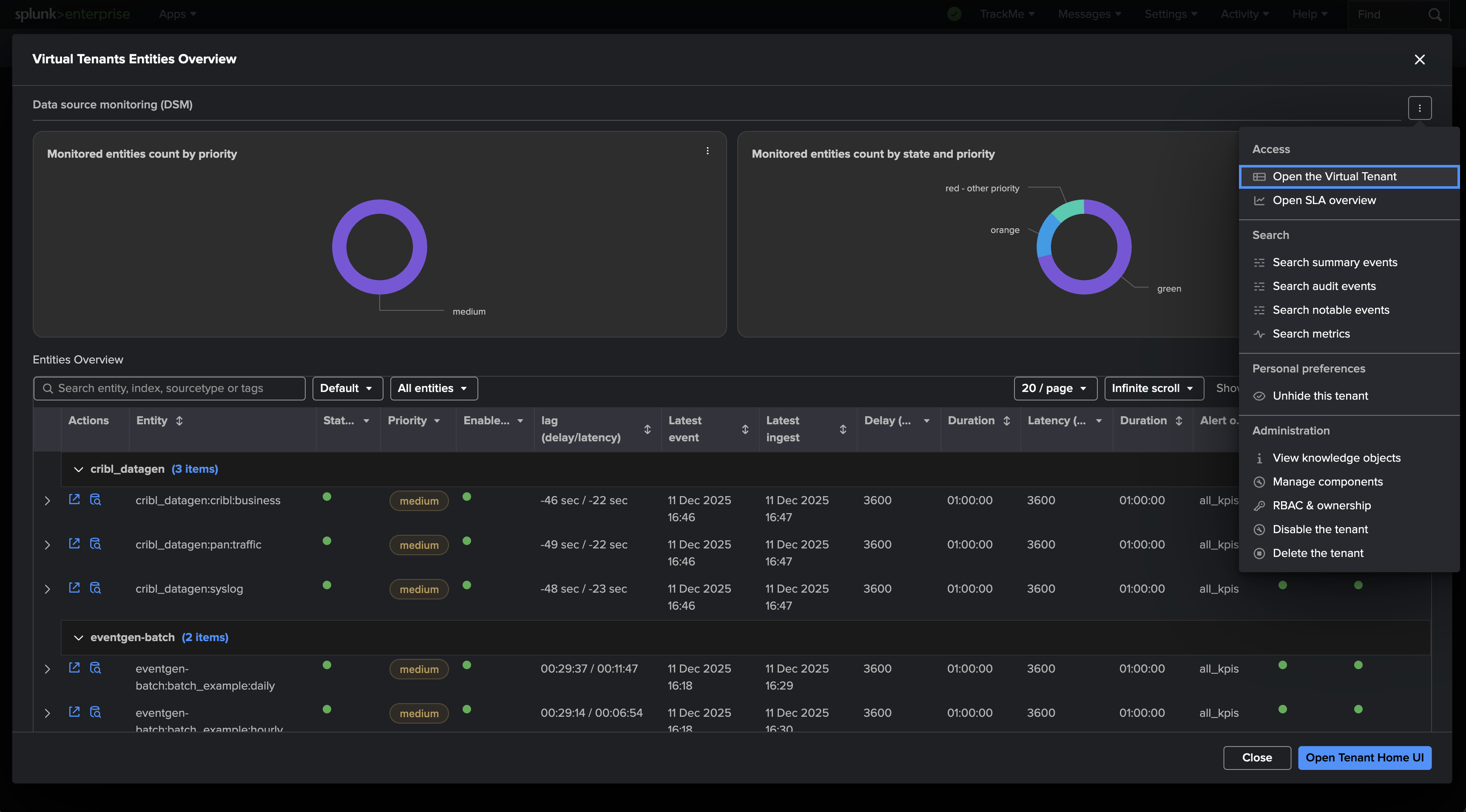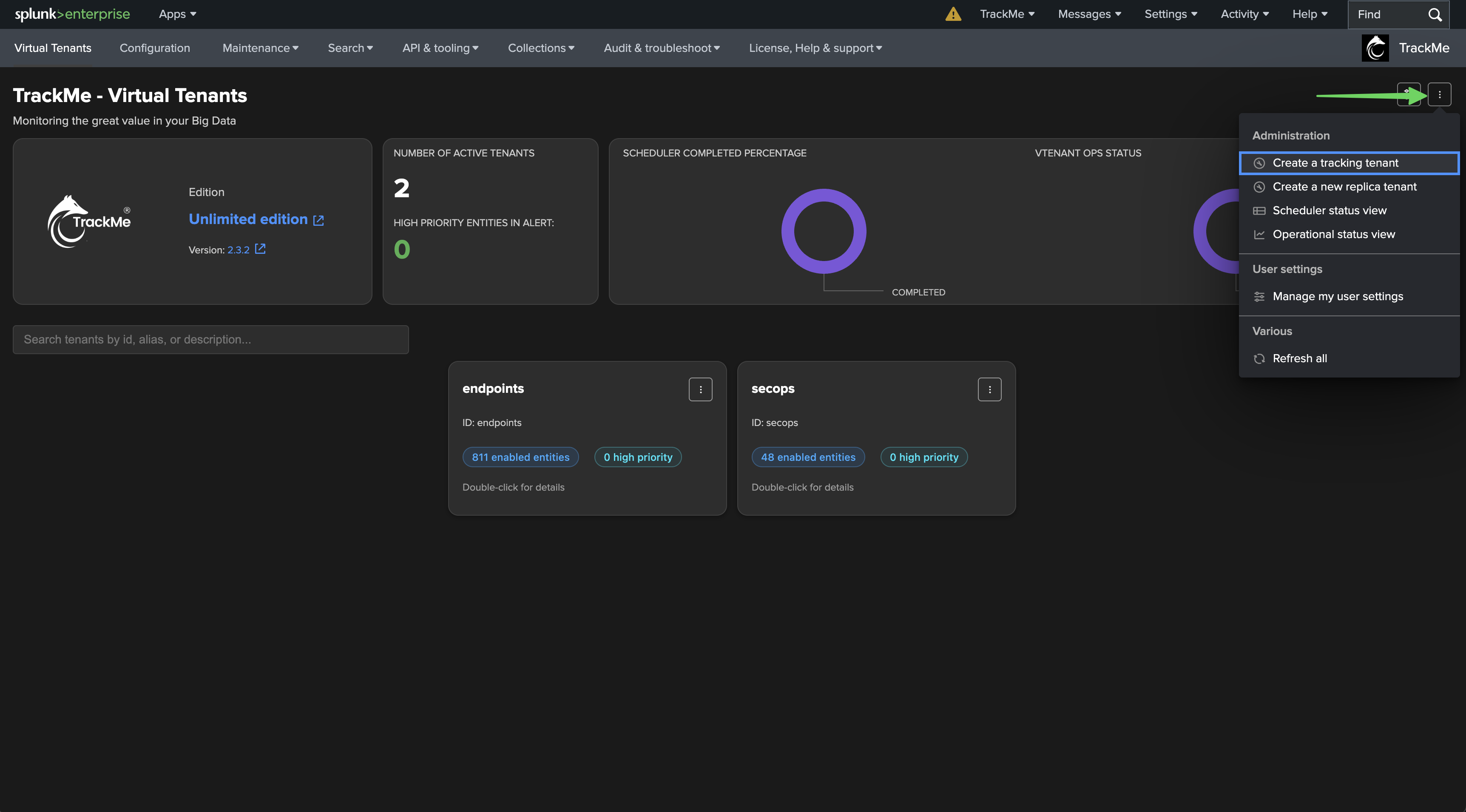 When you open TrackMe, the default page is called the “Virtual Tenant” interface.