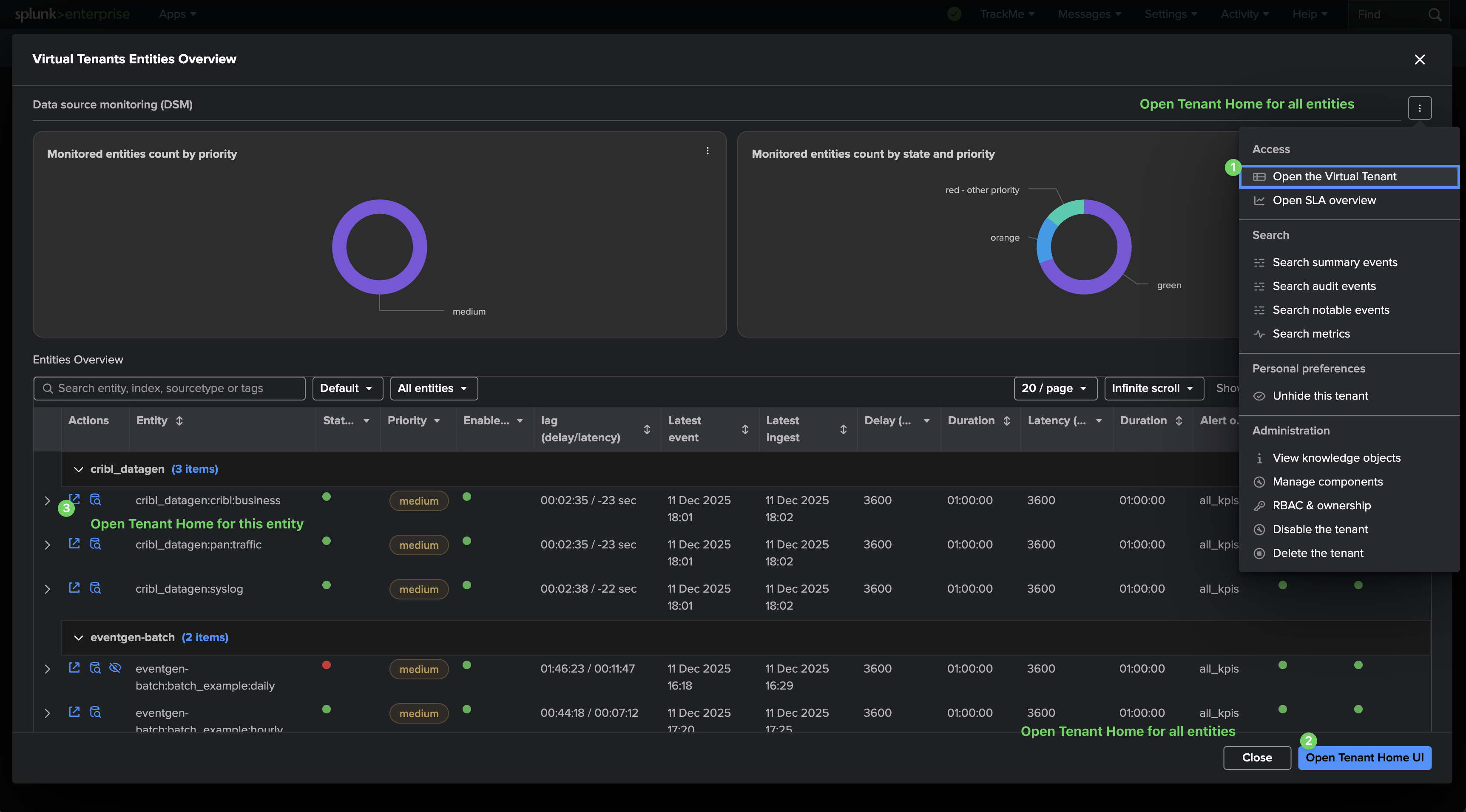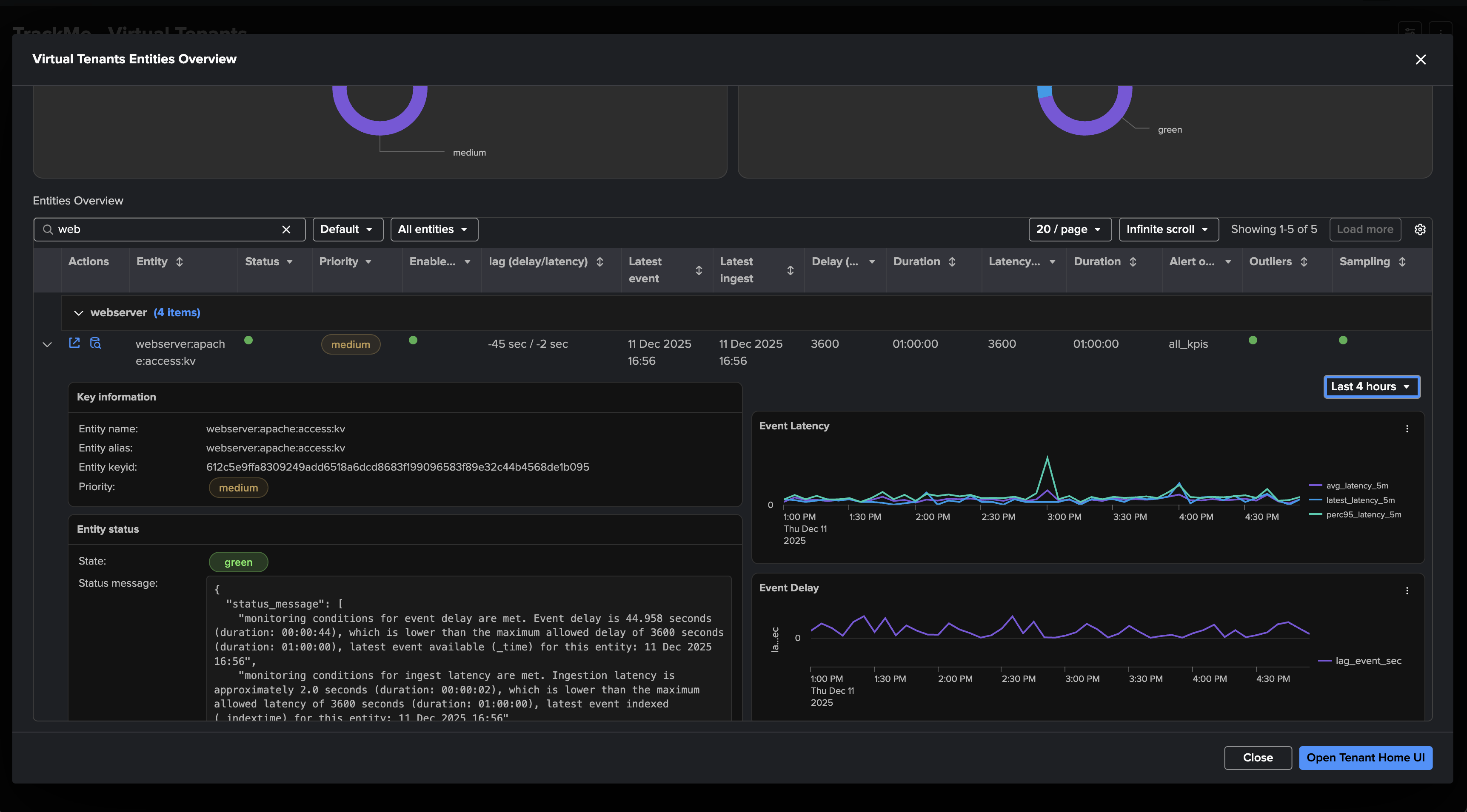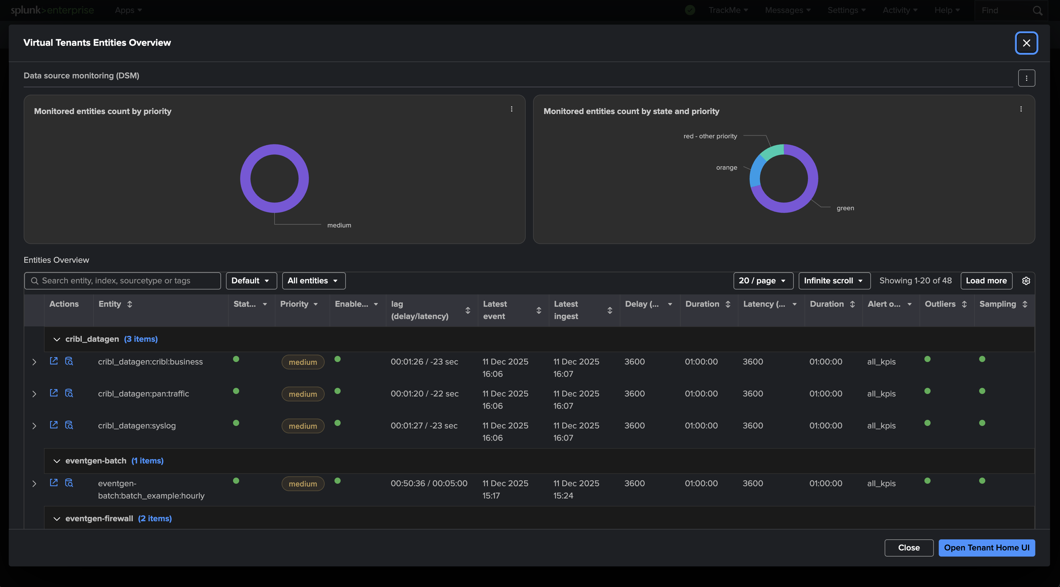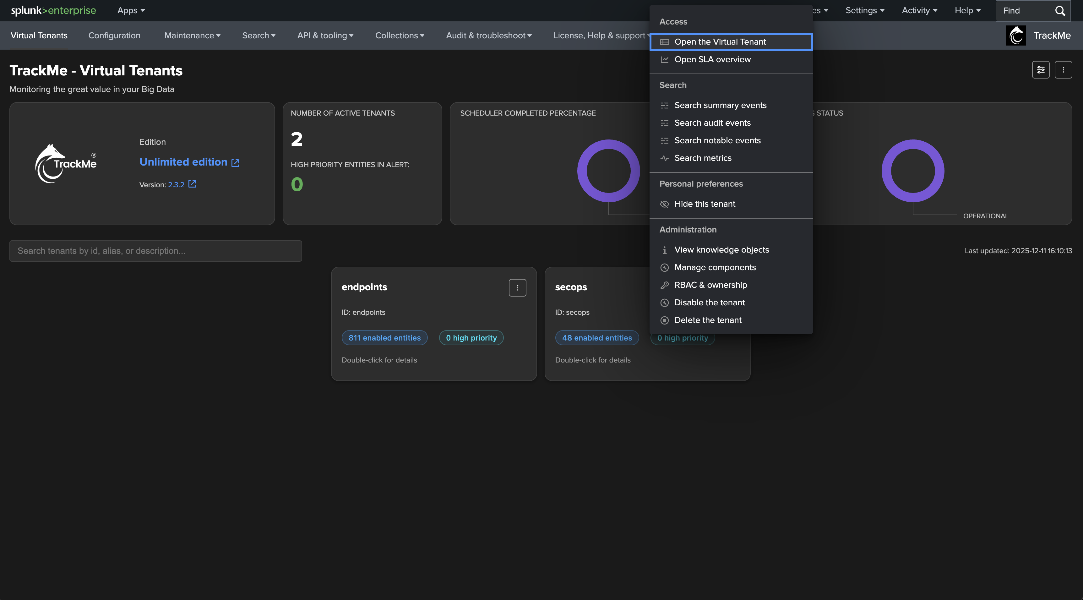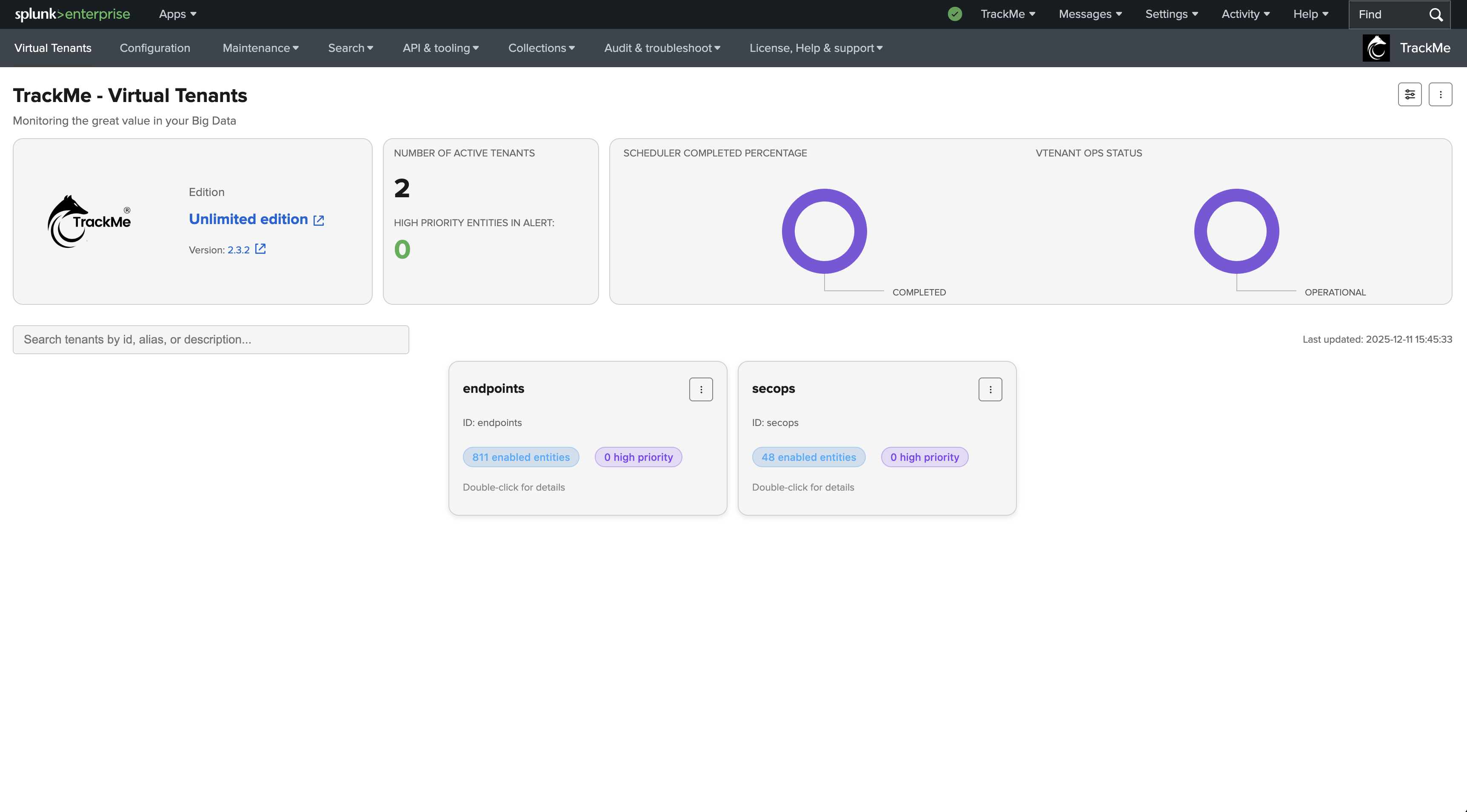 When you open TrackMe, the default page is called the “Virtual Tenant” interface.