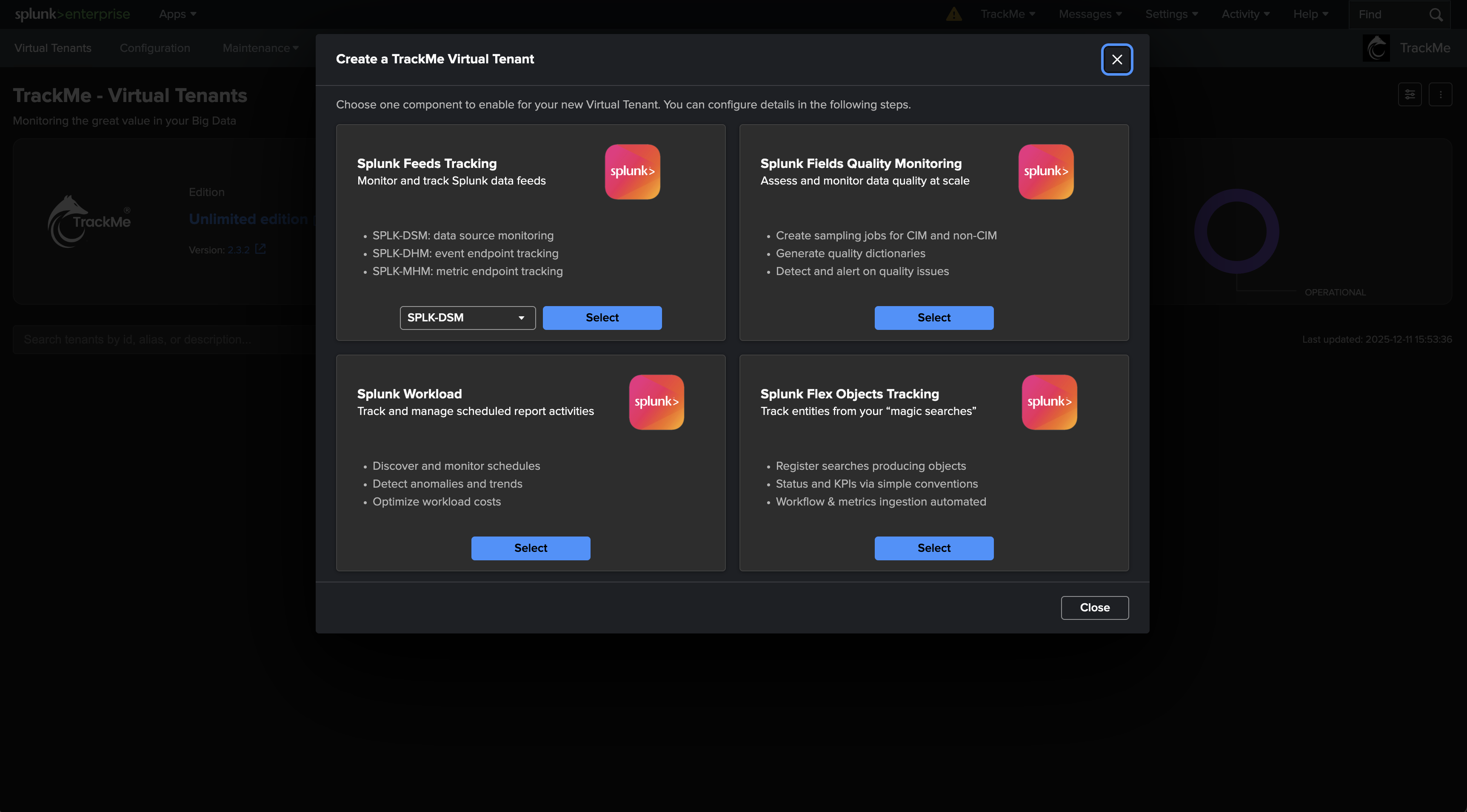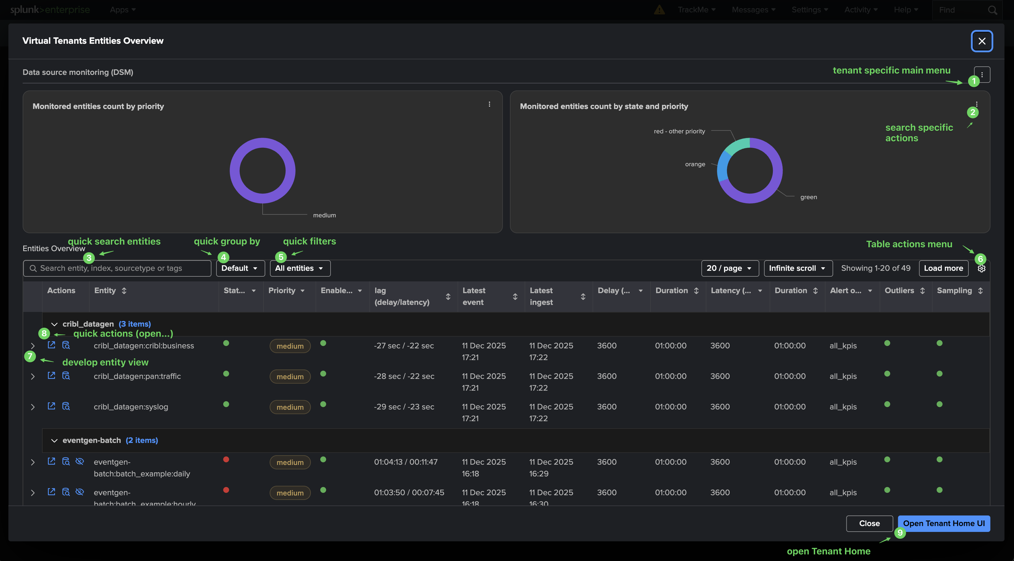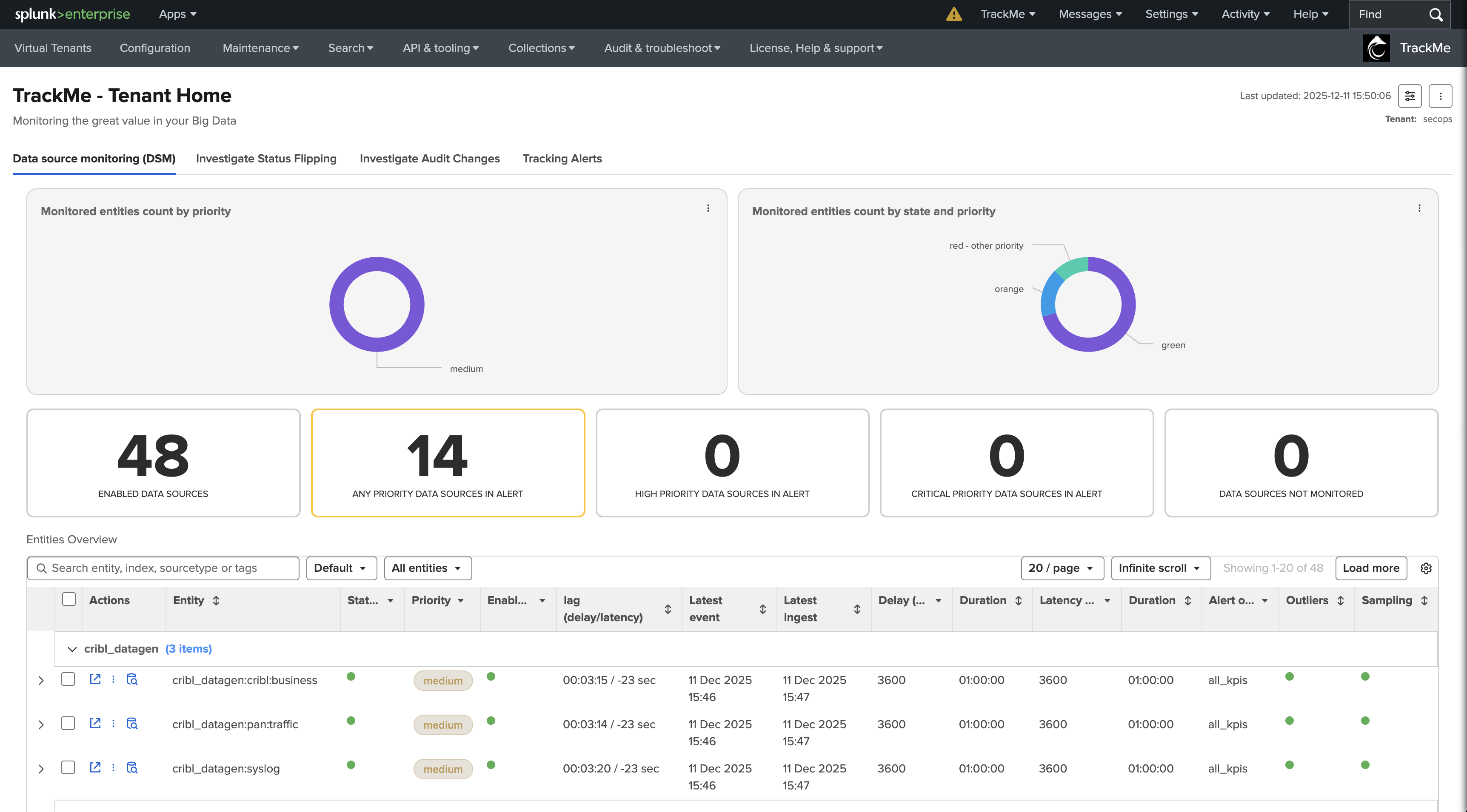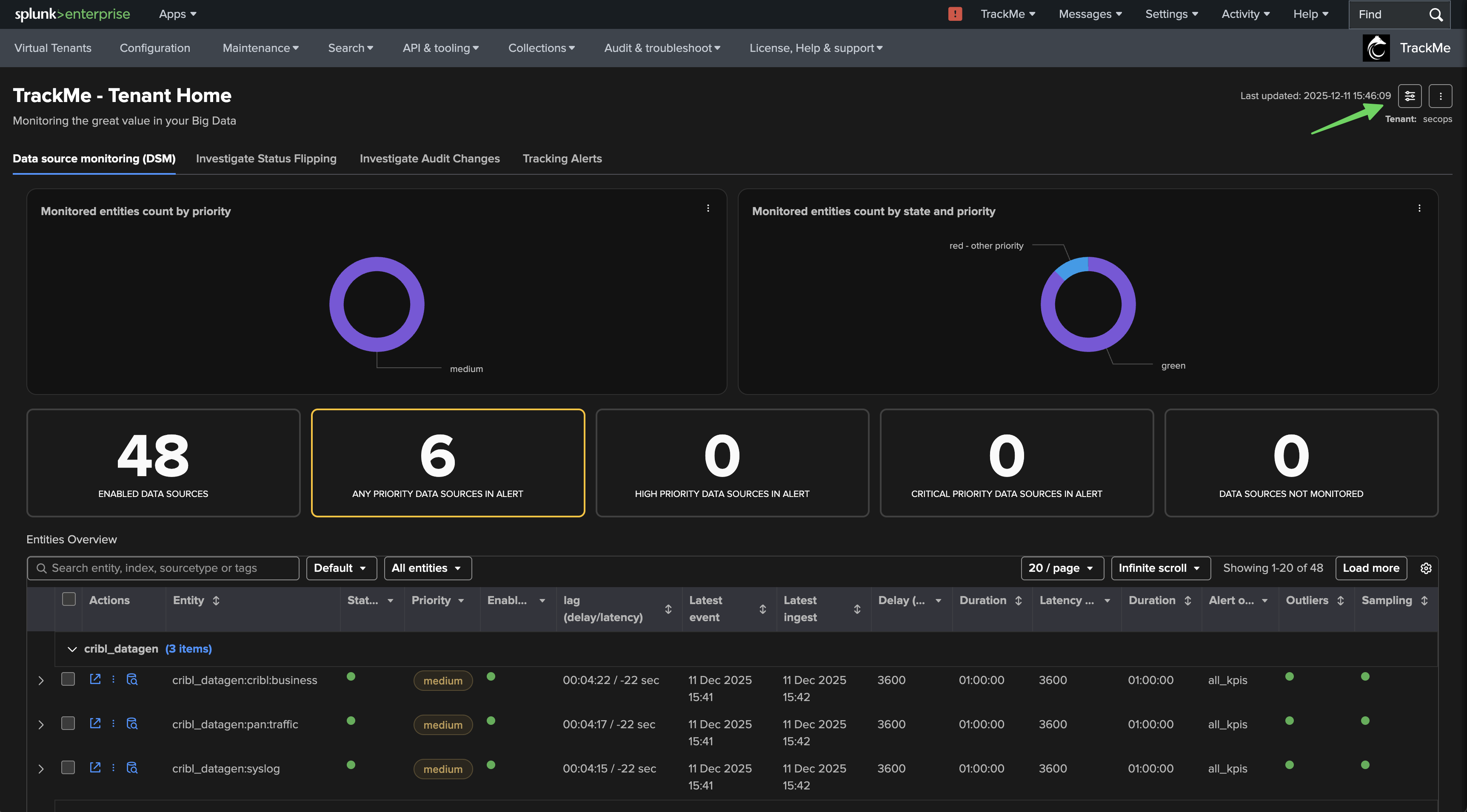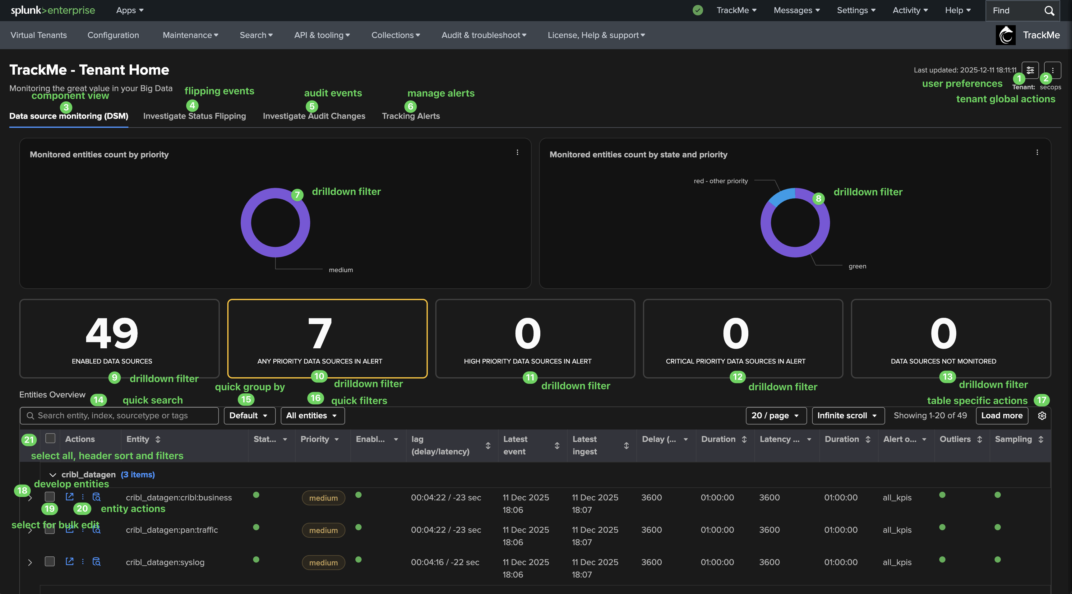When you open TrackMe, the default page is called the “Virtual Tenant” interface.