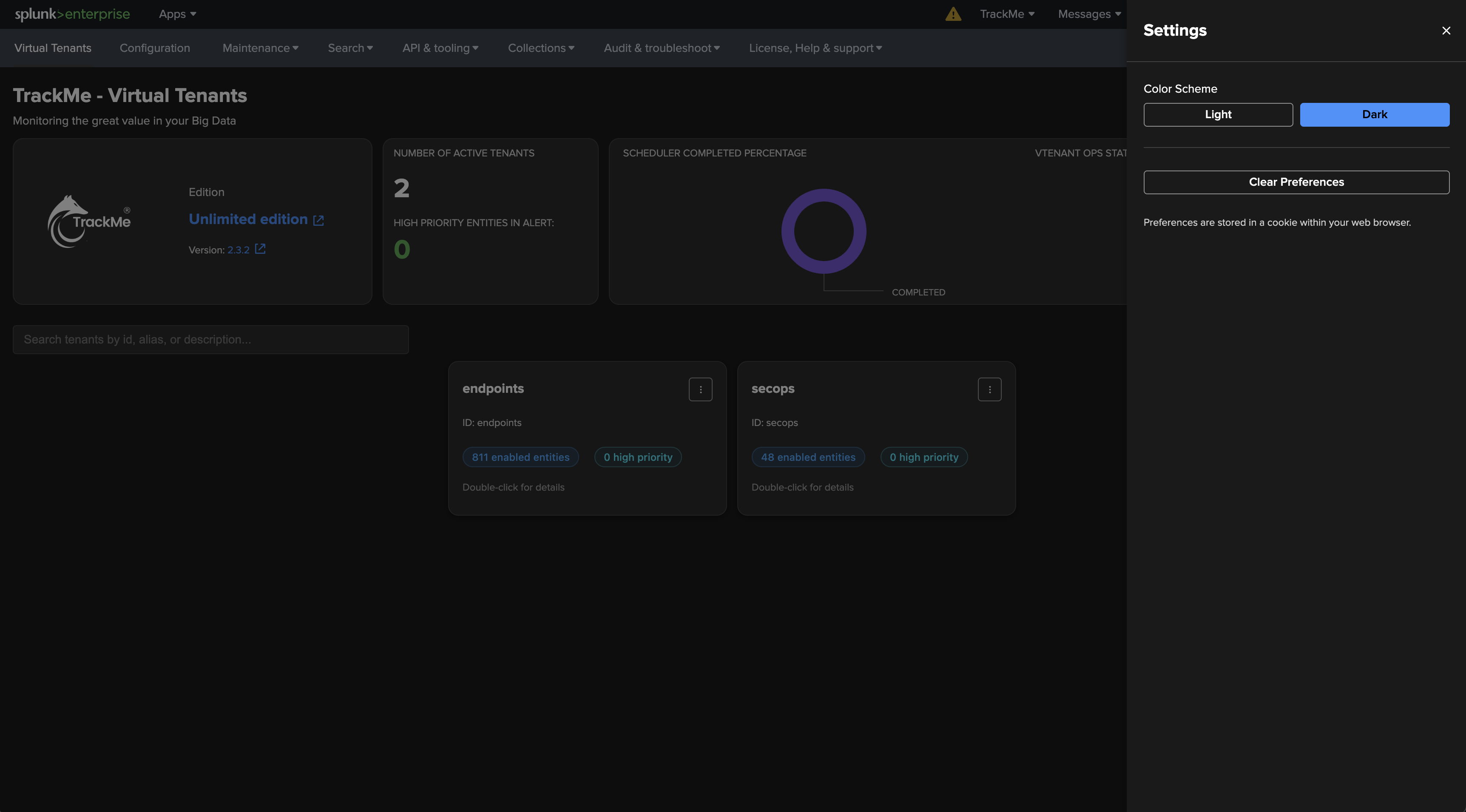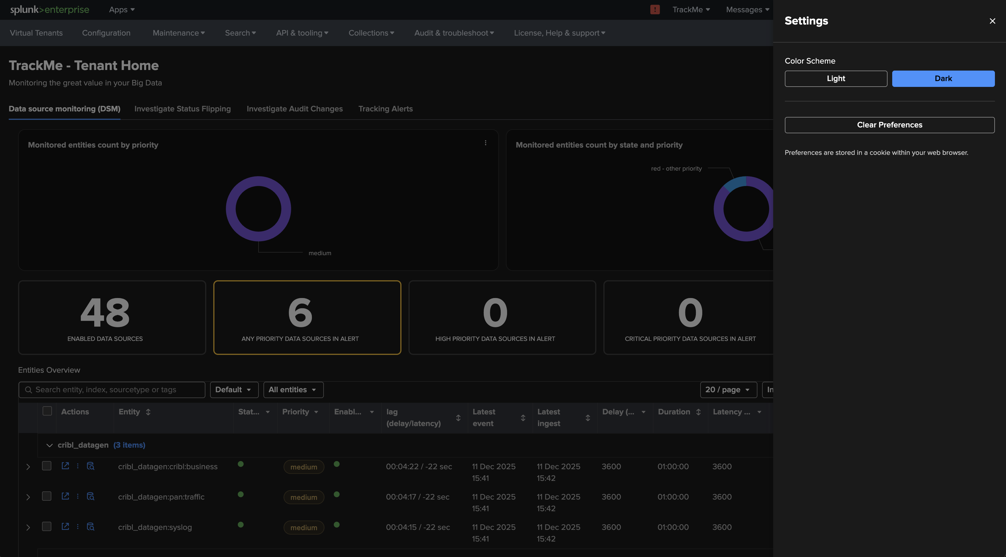Preferences can be set for each user in a persistent manner, and are stored in a user cookie of the Web browser. Administrators can also choose to set the default theme for all users landing into TrackMe for the first time, the default theme is dark mode after the installation of TrackMe.