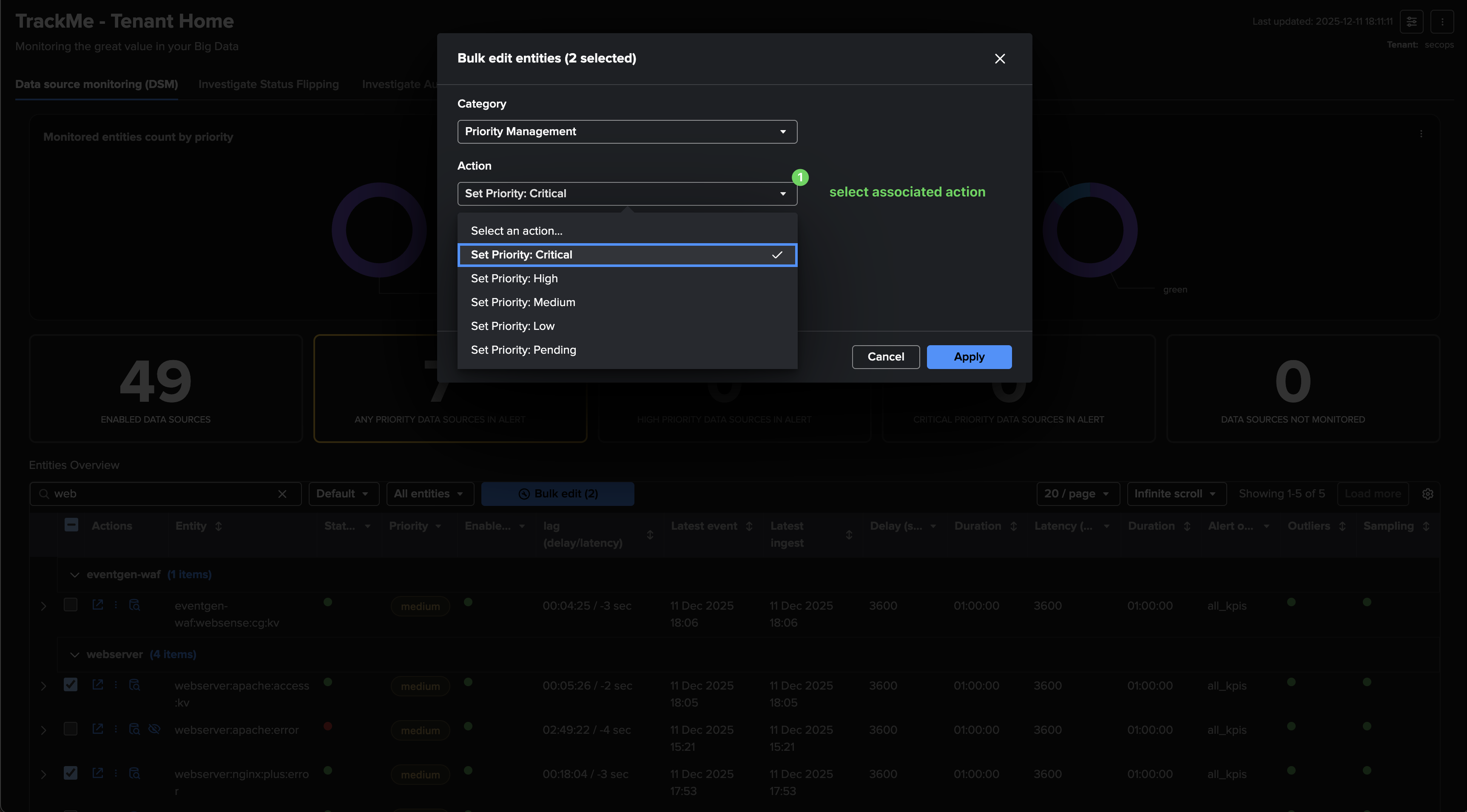 The Tenant Home interface supports dynamic bulk editing actions, to perform a bulk edit, select one or more entities and click on the bulk action button which appears automatically: