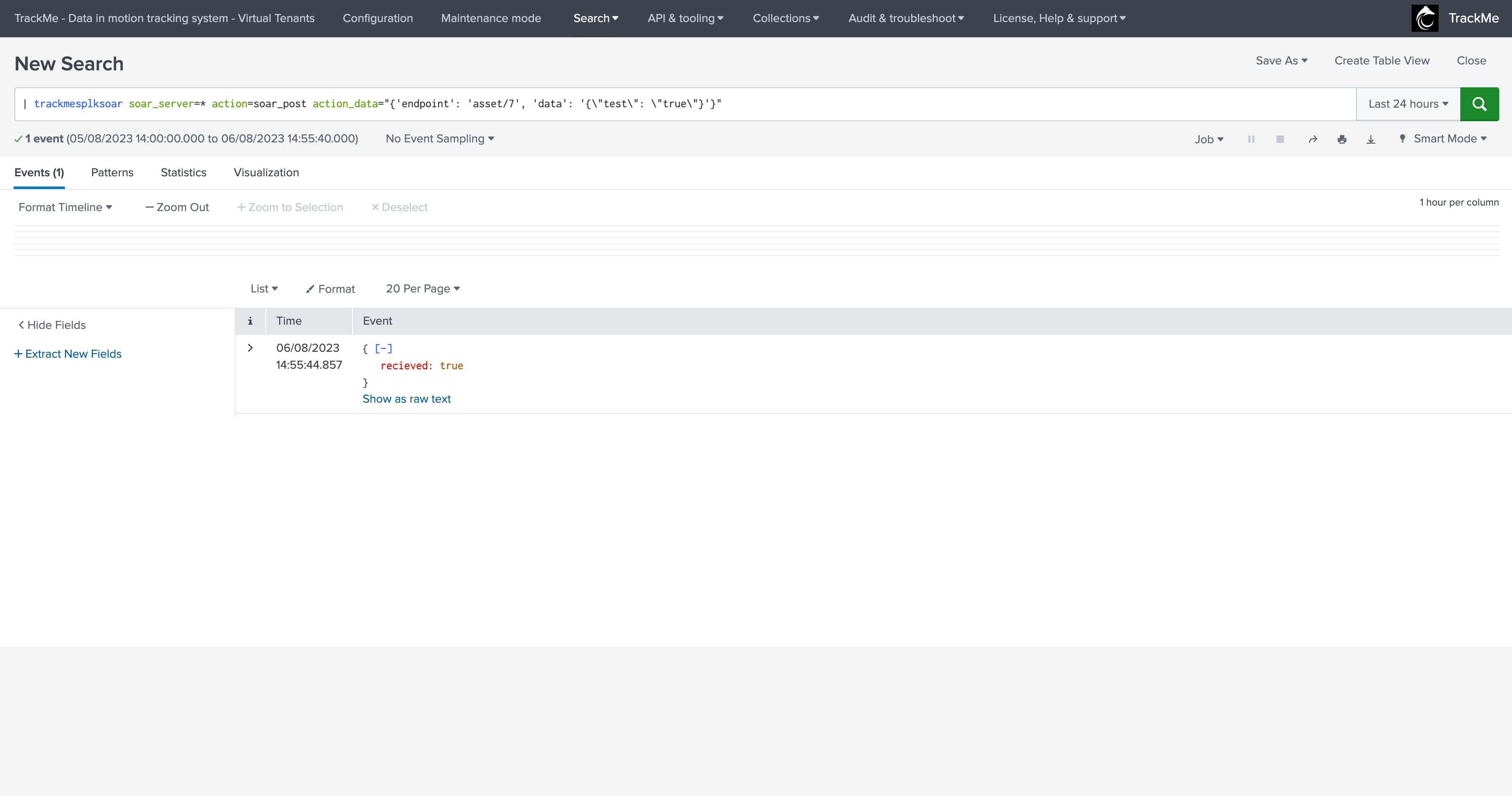Note: “received: true” is the actual response from SOAR, this is not a typo from TrackMe but a typo in the SOAR API currently for this endpoint!